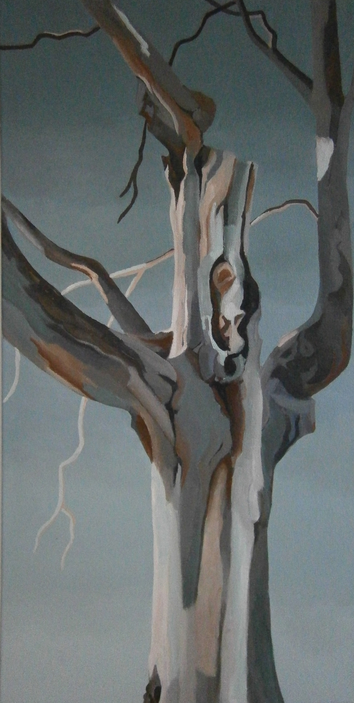 Many of the paintings blend a high level of abstraction with a vestige of realism and reality, fusing the human and tree to disclose mere glimpses of a figure.