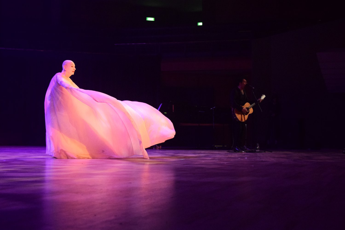 Then comes the fourth rendition and this is where a touch of genius arrives and soars in expressive grace in the form of the performance artist and dancer, and early mentor of David Bowie and Kate Bush, Lindsay Kemp. Resplendent in all white costume and face make-up he resembles a Kabuki androgyne with outstretched elongated arms he glides and smoothly contorts becoming the sentiment implicit in the song. As the lights change he is a golden figure of a gracefulness divine, an astonishing feat for an eighty year old and the nearest thing to exquisite I have witnessed in a long while. All too soon the song has ended and Kemp dissolves into the darkness and a moment of pure magic has flown.