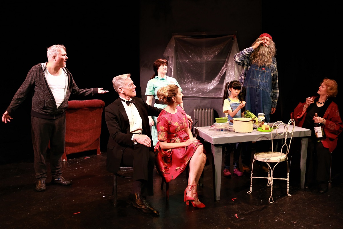 Goldfish, the first of the triad and directed by Ploetz, has some of the feel of a grittier, more eclectic New York City that is increasingly vanishing today (and, relatedly, some of the feel too of a strain of NYC plays represented by playwrights such as Edward Albee). When the play opens, following a piano rendition of "Happy Birthday" merged with Beethoven's "Für Elise," only a single guest has shown up for the birthday party held for six year-old Sabrina (Claudia Fabella) by her parents George (Christopher Borg) and Cindy (Elizabeth A. Bell). The fête is in what they call their loft (reasonable rent; no heat on nights or weekends), located in the rug district and containing an amalgamation of painting supplies, rolled-up rugs, mismatched furniture, a piano, the titular goldfish, and other heterogeneous items. The single guest is Cindy's former coworker turned business partner, Beth (Wynne Anders). Just when it seems that they will have to declare the night finished, however, a stone sails neatly through the glass-less window, announcing the arrival of Rick (Steven Hauck) and Susan (Jamie Heinlein), both invited by Beth, both dressed for a cocktail party (George, in contrast, is sporting a track suit, partly unzipped to reveal his white undershirt; and Cindy is still wearing her waitressing uniform), and trailing an impressively bearded, overalls-and-bandanna-wearing poet, Bill (Ryan Hilliard), whom they met on a street corner on the way over. What follows includes some relatively inappropriate flirting, questionable table manners, and class-inflected masculine posturing—this last allowing Hauck, whose Rick once upon a time fenced, to render the words "thrust and parry" much funnier than they have any right to be. Fabella, even with almost no dialogue, gets a few big laughs herself, including one involving a toy truck and some bones (bones, come to think of it, are another motif uniting all three plays in Dining, even if they only enter the second play through a waiter's enthusiastic mispronunciation). Intermingled with all of the strangeness and even silliness are unrealized ambitions and unfinished thoughts and sentences, an underlying lack of fulfillment such that Susan gives unexpectedly serious consideration to a proposal from George just because, she says, it would be something different.
