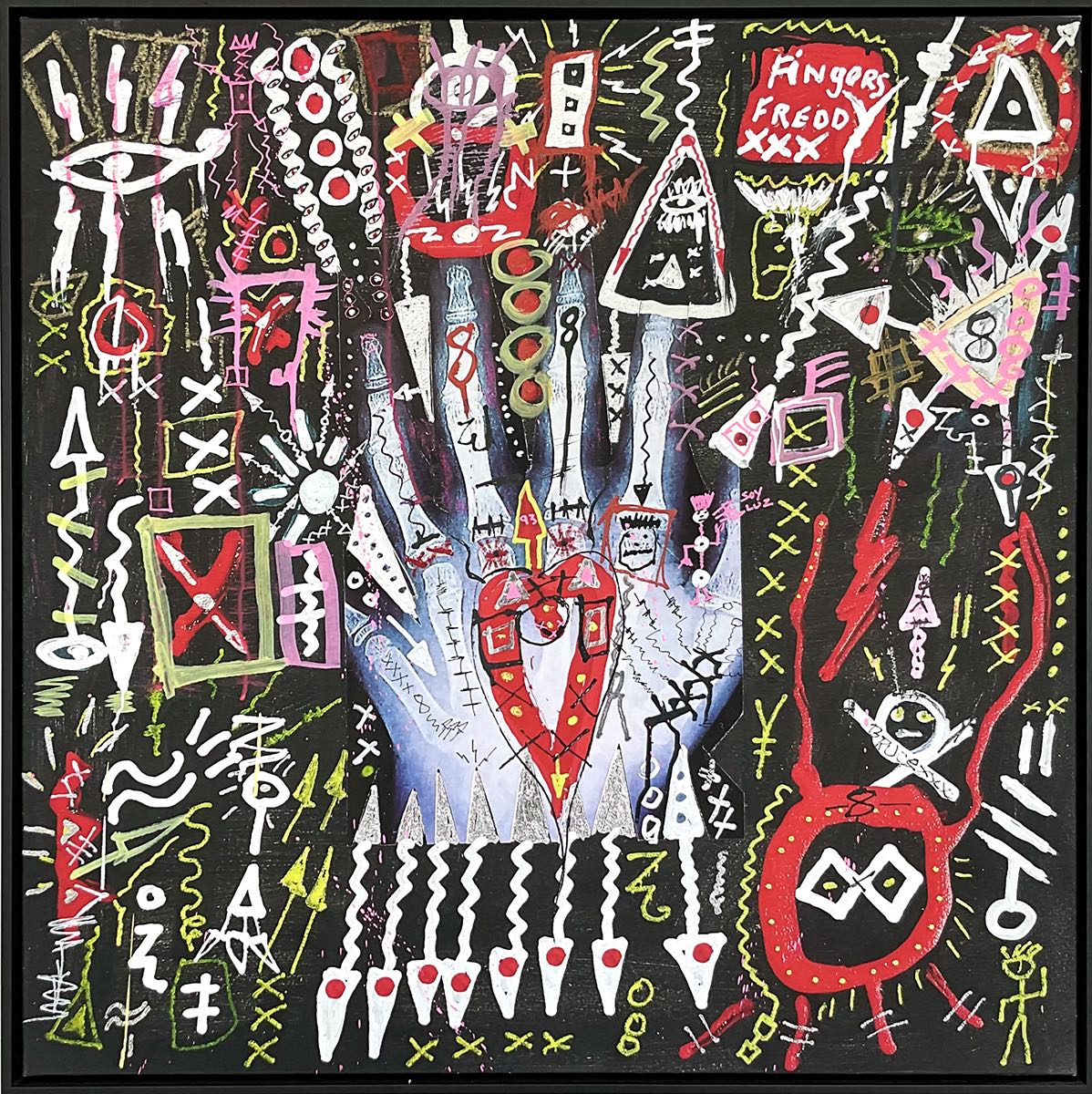 At the age of three, Vazquez traveled with his mother, sister and grandmother to America from Cuba, which at the time, would have been an incredibly dangerous journey (this was 1969, after the Cuban Missile Crisis in '63, and the Bay of Pigs in '61). By the time his family fled Cuba, the Cold War was raging, travel to and from Cuba was forbidden, and the US placed an embargo of all goods flowing back and forth, virtually isolating the island. Growing up, Vazquez was exposed to a rich history of Afro-Caribbean Religions and Deities, an exposure to the occult that would follow him throughout his life, and one that would eventually appear as cryptic signs, mysterious symbols and bold sentences in his visual art.