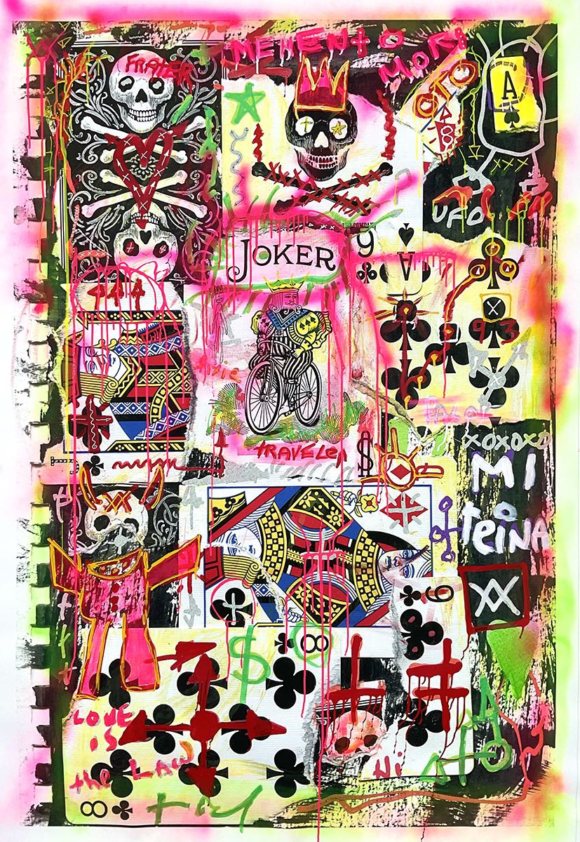 The multimedia work Joker began as a collage of bits and pieces of playing cards that happened to have the compelling distinction of a skull and crossbones on the back. Vazquez tags the blown up version of that collage with animated hearts, stars, squiggles and sprays, which are partnered with various phrasings like "Memento Mori," "Love is the Law," "Traveler" and "Mi Reina" (My Queen). Taken in all at once, a voodoo vibe breaks through the layers of iconic images, passionate declarations and whirlwinds of emotion that leave us with a potent and mesmerizing visual.