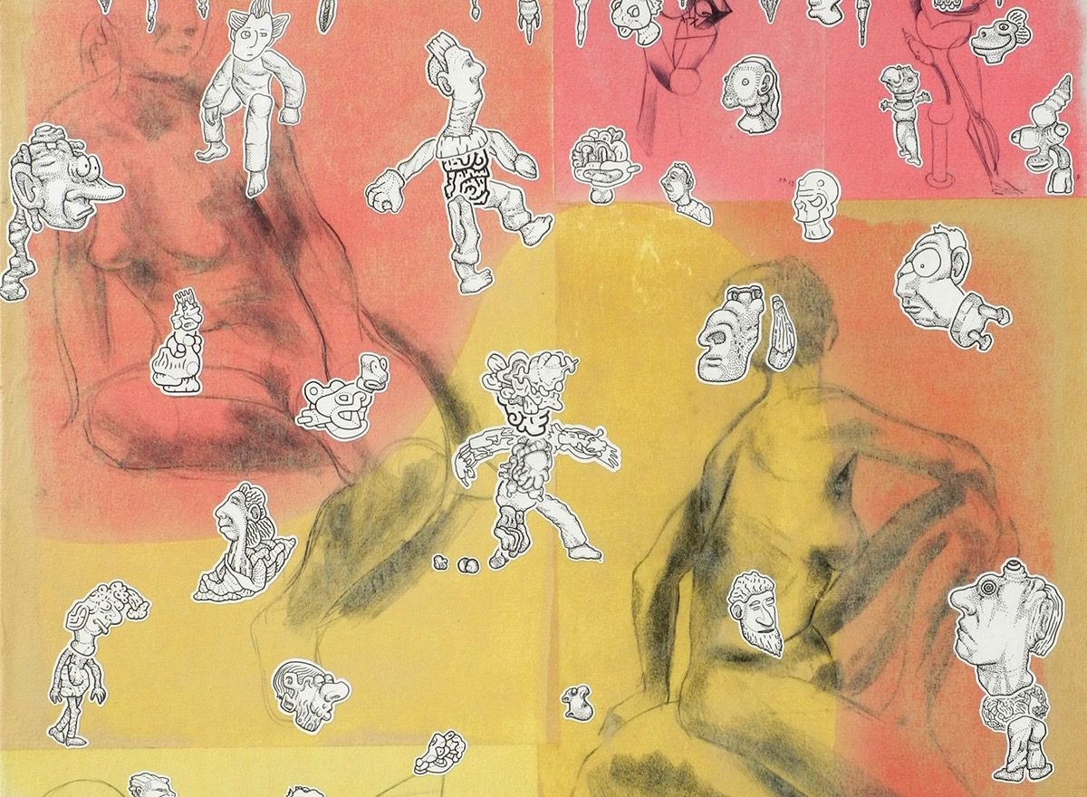 Mining the collective unconscious, he layers discordant imagery such as figure drawings, themselves efforts at "high art," with floating signifiers from the nether world of dreams, racing thoughts and hallucinations. Set against activated paint backgrounds, these elements interact in a sort of parallel play, inciting each other and sparking the proverbial Surrealist jump in order to reveal the uncanny within the familiar.