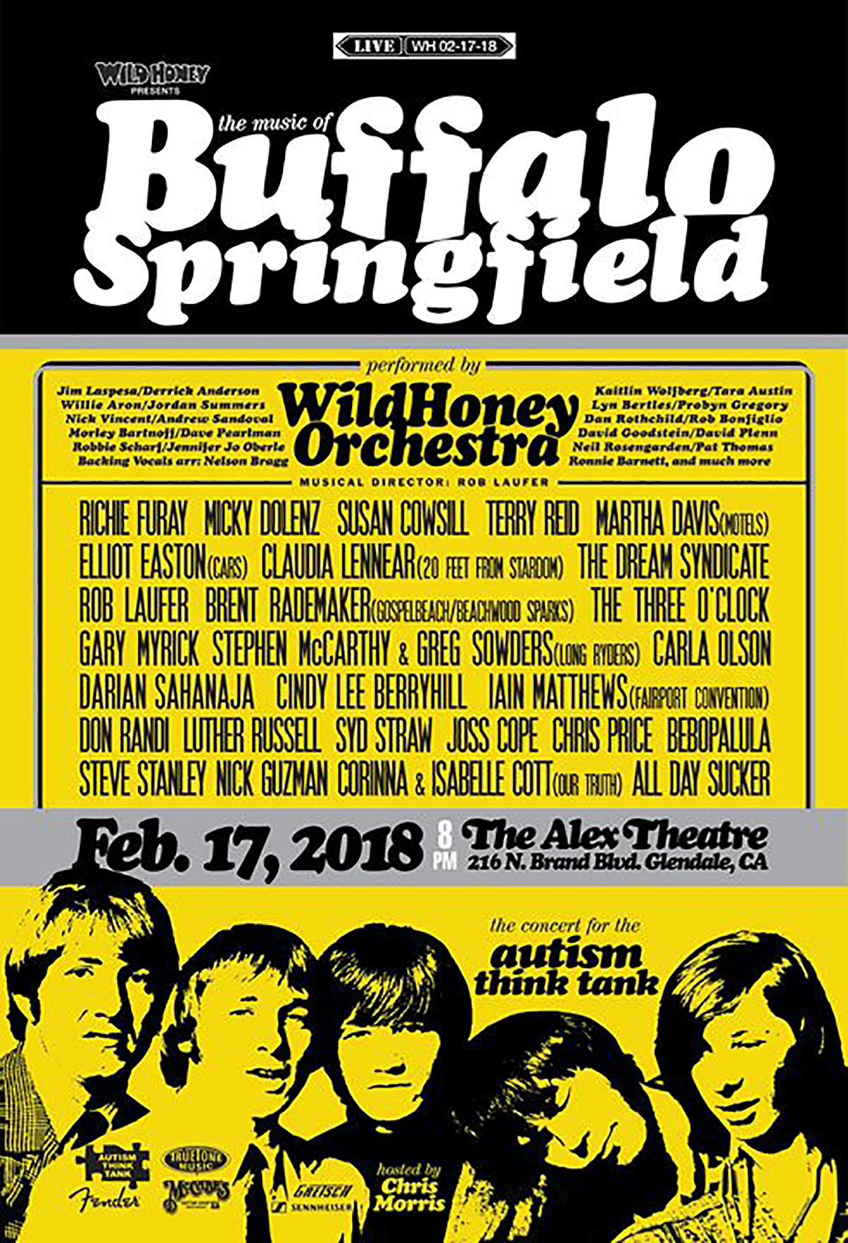The Wild Honey Foundation started putting on themed benefit concerts a quarter century ago and was revived a few years back, now benefitting the Autism Think Tank. A collection of superb Los Angeles-based musicians with extensive résumés comes together, led by guitarist Rob Laufer (Johnny Cash, George Martin, Cheap Trick, etc.) as The Wild Honey Orchestra to back special guest stars (many, but not all, also L.A.-based) and augment existing bands, this year performing songs of Buffalo Springfield, the band that shot Stephen Stills, Neil Young, and Richie Furay (Poco, Souther-Hillman-Furay Band) -- along with bassist Bruce Palmer (later Jim Messina) and drummer Dewey Martin -- to fame in the late '60s.
