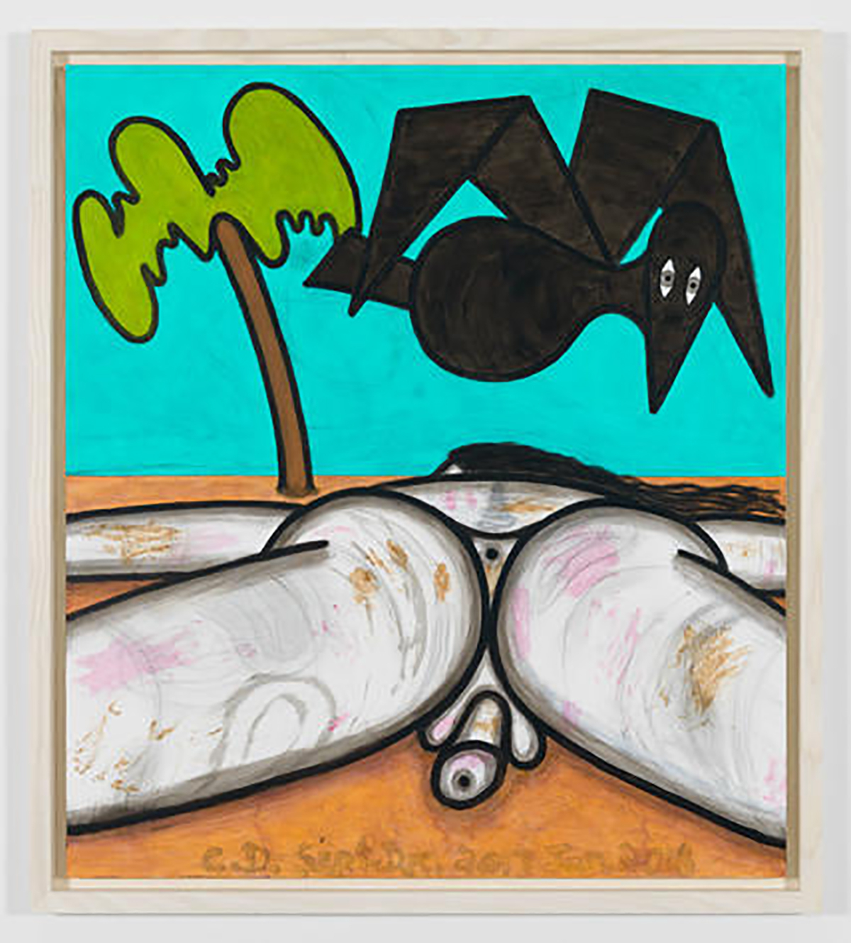 This time is no different. Painted in 2017 they are not necessarily about the American election. Despite that many of the paintings are of two cavemen with bushy manes and floppy dicks battling it out in the woods. I see the wrestling figures from Poussin's Rape of the Sabine Women of 1612 and something of the simplicity and figural dynamism of Picasso's Figures on the Beach of 1931. Dunham creates a great, in the middle, in your grill, physicality. He has stripped the figure back to grubby white canvas contained by a thick black line. There's a tree green and a sky blue. But after that there’s not much left on your plate to eat, other than the meat and two veg.