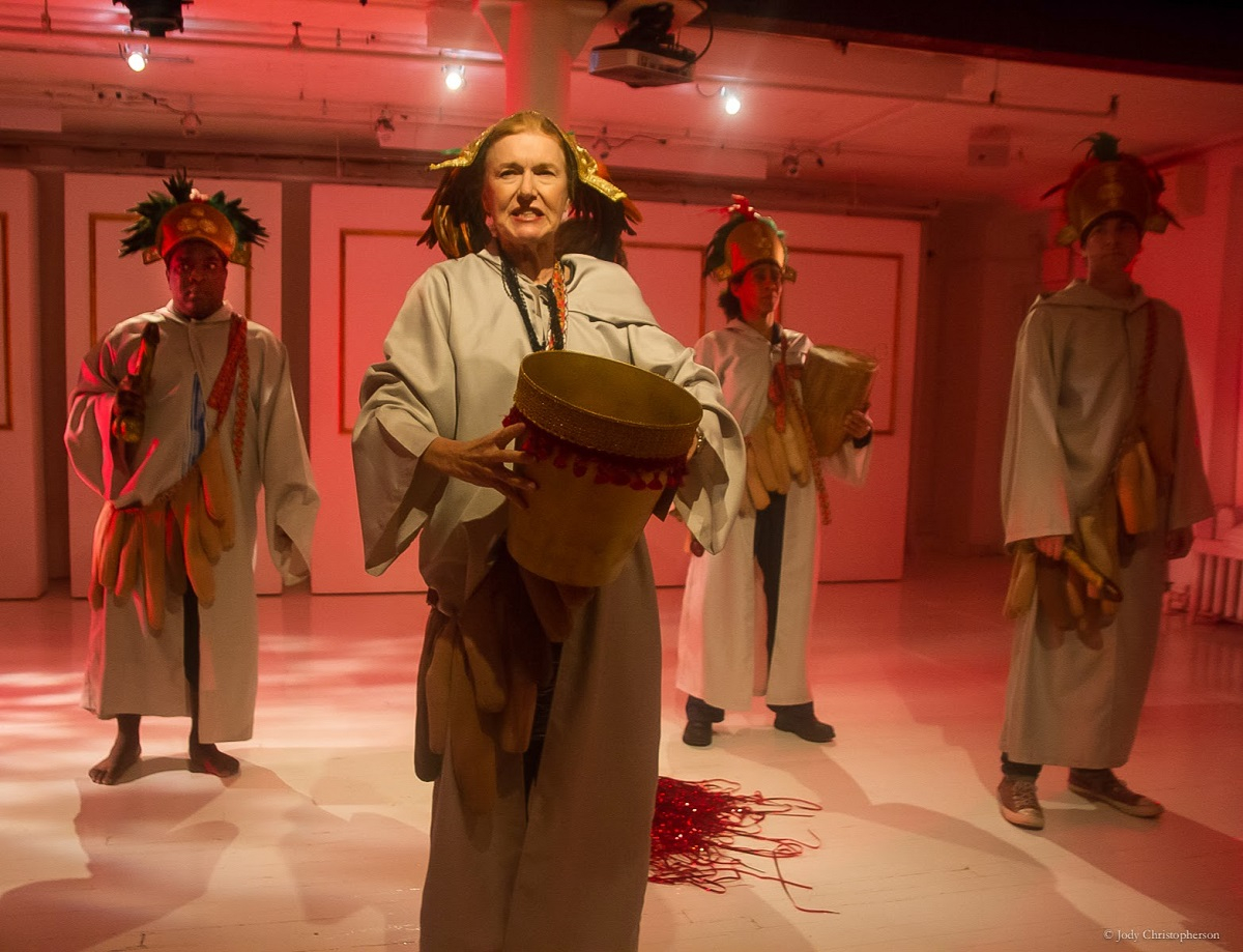 The first character whom we meet, Mrs. Marbleblatt (June Ballinger) is stepping down as headmistress of a private girls' school due to a scandal whose particulars we won't spoil here. Her introduction -- laugh-out-loud funny sprinkled with social critique and unexpected turns -- immediately sets the tone for the rest of the production, and Mrs. Marbleblatt's decision, as a newly wealthy widow, to become a patron of the arts will eventually bring her to cross paths with middling (straight, white, cisgender male) artist Calvin (David Gelles), who begins the play under pressure to come up with a show for his friend Fyn (Bruce Jones). Fyn, a gender-fluid African American, owns a gallery on New York City's Lower East Side, for which they hire two new art "handlers" (Lynne Marie Rosenberg and Erinn Holmes) to take care of the hanging, positioning, and other manual labor involved in exhibitions. When Calvin tells Grace (Kate Abbruzzese), his publicist and romantic partner, about his plan to make his own penis the subject of his show, she is less than impressed, but an incident involving her smartphone will ironically change her perspective, as well as her, Fyn, and Calvin's lives.