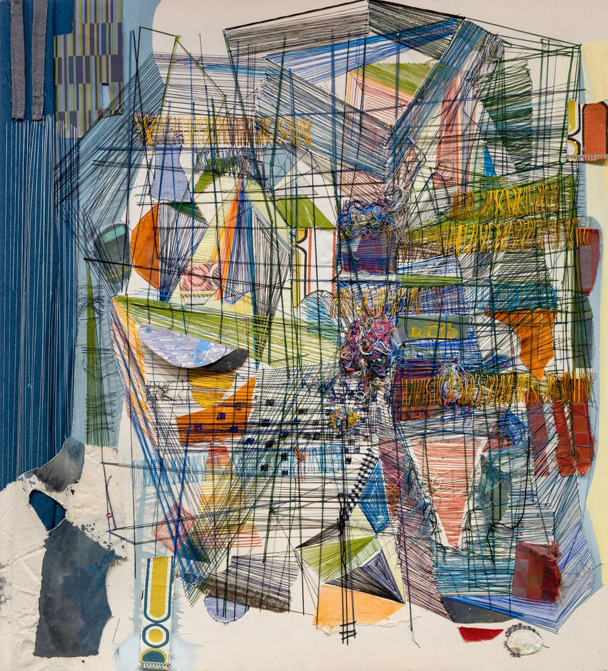 The Fabric of Space, curated by Thalia Vrachopoulos, conveys an unusual vision by Eozen Agopian that borrows from Cubist art without in any way replicating its intensions. At first glance the similar-sized shapes in Agopian's works spark the link that soon dissolves as the intricacies of her elaborate overlapping configurations of colored fabric and skeins of thread invade one’s senses. The intelligence of these spaces and movements quickly takes precedence over the superficial initial impressions of the moment. In a city where abstract art reigns, and holdovers of gestural abstraction from the heyday of Abstract Expressionism remain intact for decades, it is a pleasure and a relief to discover an artist whose convictions are backed by the strength of her individuality.