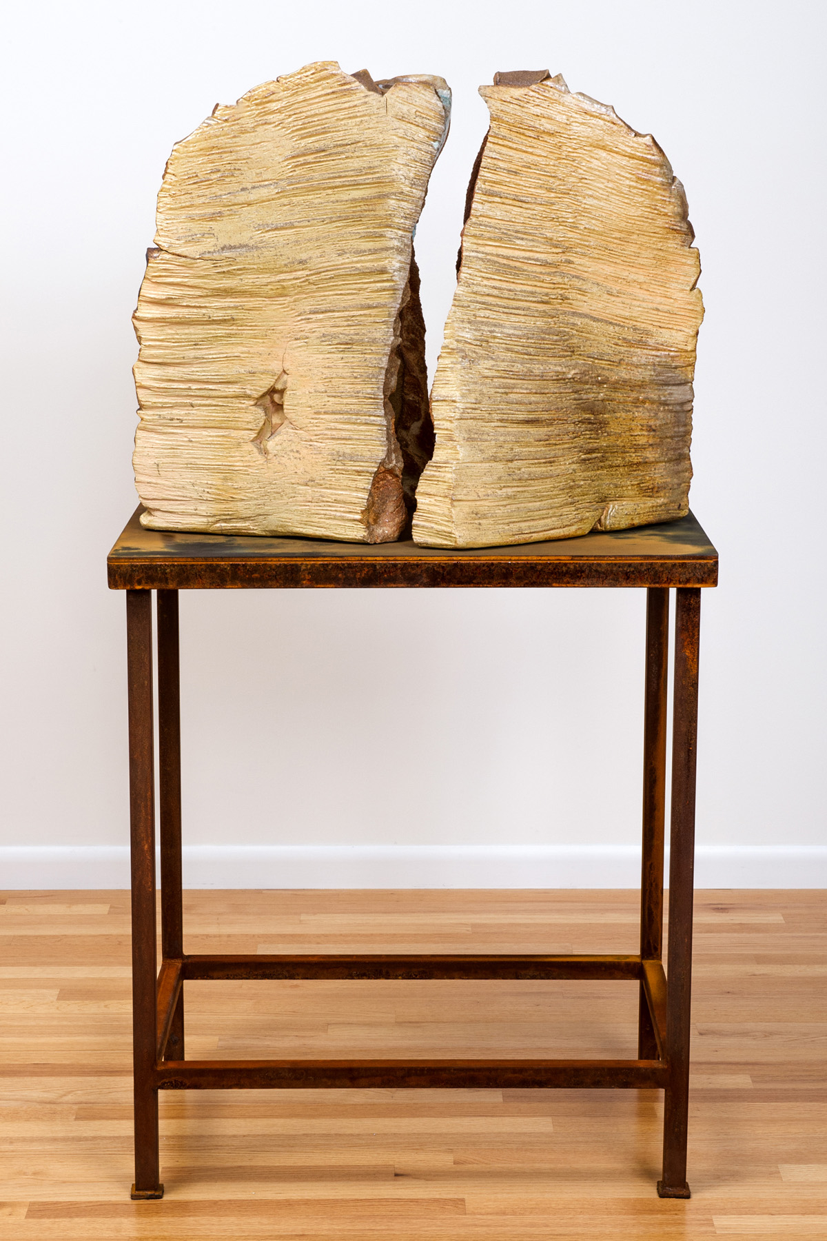 The second work, Voice, began its kiln journey as one solid mass. It developed a central crack in drying -- a kiln glitch gone right, a beneficial accident. Its surfaces, gorgeously raked and striated as if Nature were the sculptor, evoke a sense of geological process. Imagine rock formed over eons by earthquakes, by water and extremes of temperature. Peering into the crevasse of this two-fold piece, into the tear itself, we strain to see its full contour, catching but a glimpse of two interior chambers, one on each side. We wonder what they might hold. A sleeping bear? An entombed Pharaoh? The bifurcated womb of Mother Earth, herself?