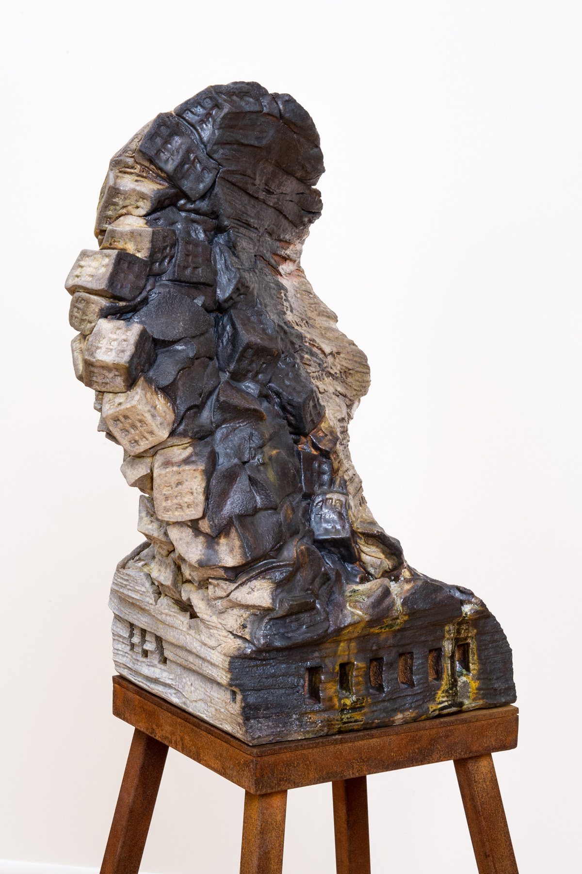 Surface colorations transition from rich yellow-browns and umbers, to charcoal grays and blacks. We wonder: Has some unseen force been brought to bear upon this mass? Are we being shown a thing in the process of decay, beautiful in its undoing, redolent of things of the earth, of mud, of blackened soil? Regarding the ganged and sliding cubic shapes so alien to this otherwise biomorphic body, our thoughts turn to man-made things, to architecture or to children’s toy blocks. There is something apocalyptic and chaotic -- a colliding of the natural and the constructed.