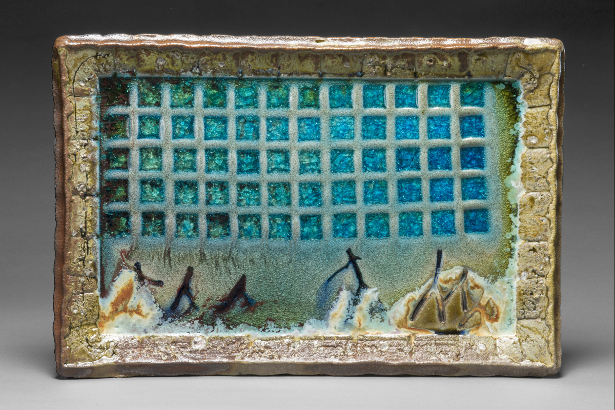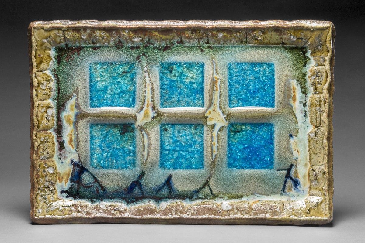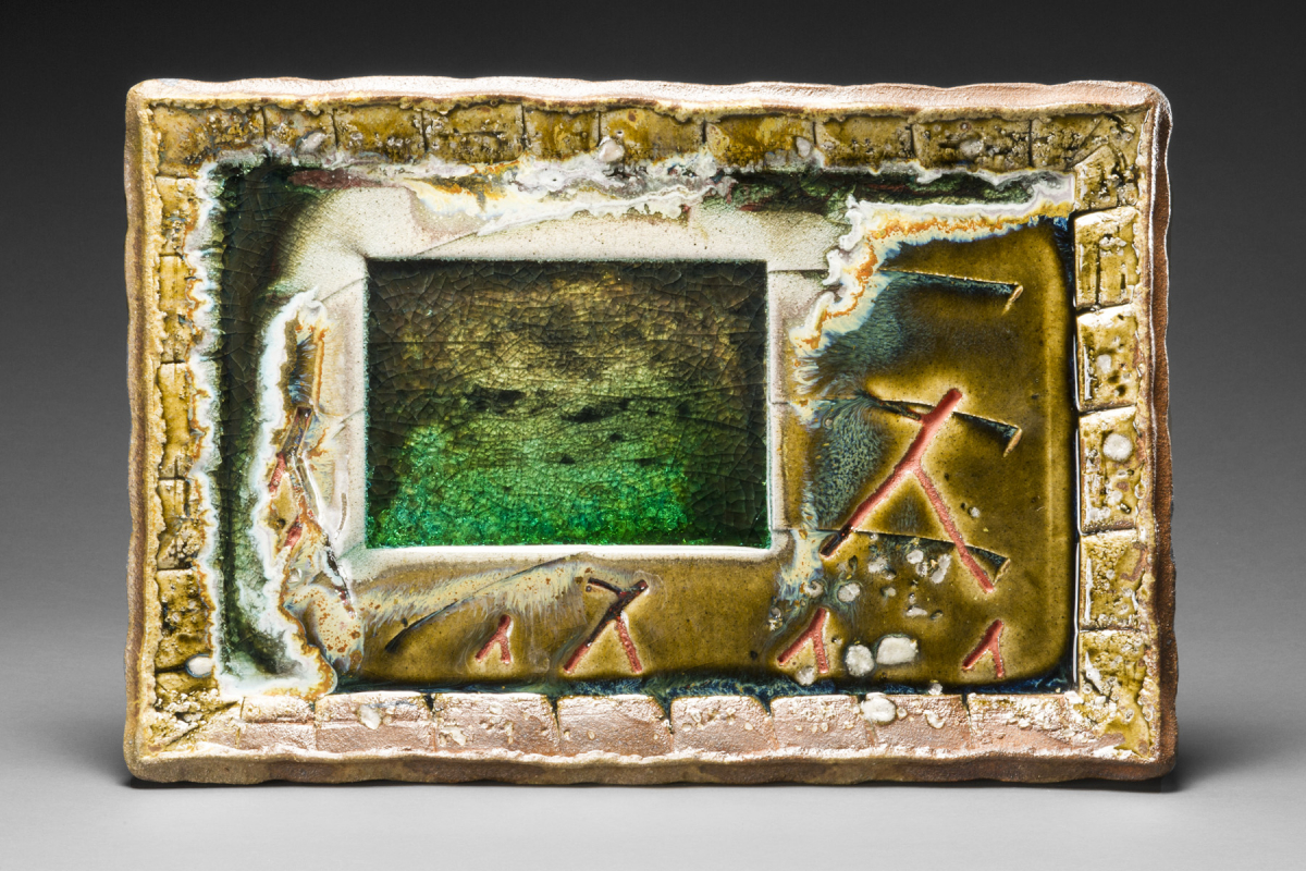 The second body of work, Moore's Fire Paintings, sing out from the gallery walls. These gleaming chunky rectangular clay slabs are hybrid forms. They have the weight, bulk and dimensionality of sculpture while functioning like painting, as frontally viewed wall-hung works. In their making, Moore added glass and impressed plant matter into the clay, along with a series of luminous glazes. Kiln fire and time transform these "burnt offerings," melting, fusing and pooling pigments and melted glass to create beautiful surfaces and imagery that is both abstract and figurative, often at once. Gaining knowledge of materials and their performance "under fire," Moore's studio experiments evolved to become less random and more directed over time.