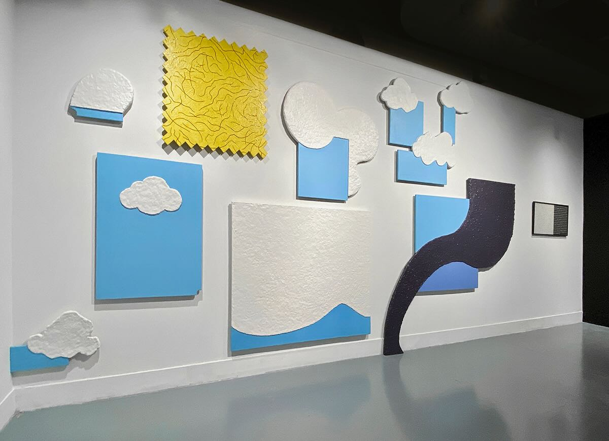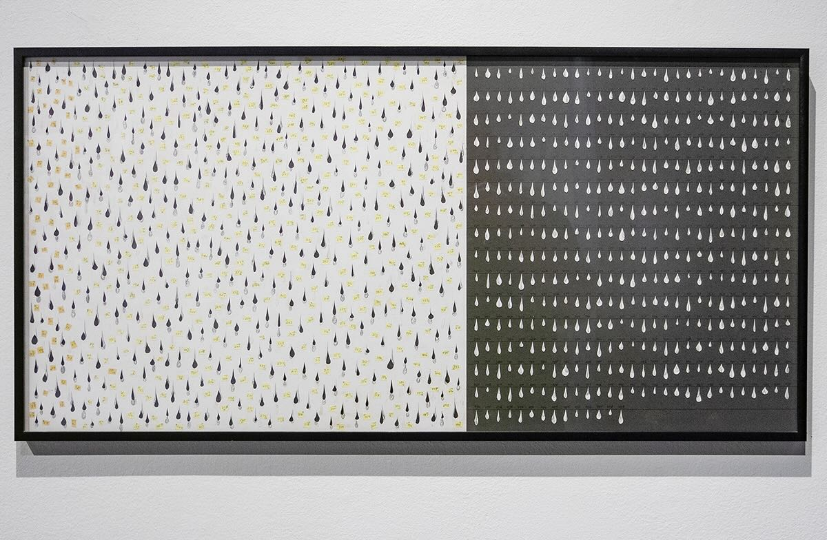 One striking juxtaposition in Garrison's staged sky is the sun, Hand Study 5, which is comprised of a jagged, butcher-block design, heavily painted with puckered yellow latex paint and adorned with slices of paper, spray painted red that trace the creases in the palms of the artist’s, and other subject’s hands -- an element that can be seen in various works that so powerfully state the omnipresence of the hand of mankind in nature. The sun, as we earthlings understand it, is impossible to change or affect, even if we could get close enough to actually do anything about its structure or power. However, in this instance, the artist has taken the aforementioned elements of hand creases and clustered cubes of painted and collaged wood to reimagine the sun as an oddly shaped and sutured form. Seen together, Hand Study 5, Smokestack and the diptych 449 Drops; which features two narratives: one grouping of numbered raindrops in a chaotic pattern on a light background, and another series of droplets arranged neatly, systematically and numerically on a dark background, all puts a fine point on our inability to work with and not against the powers and presence of nature.