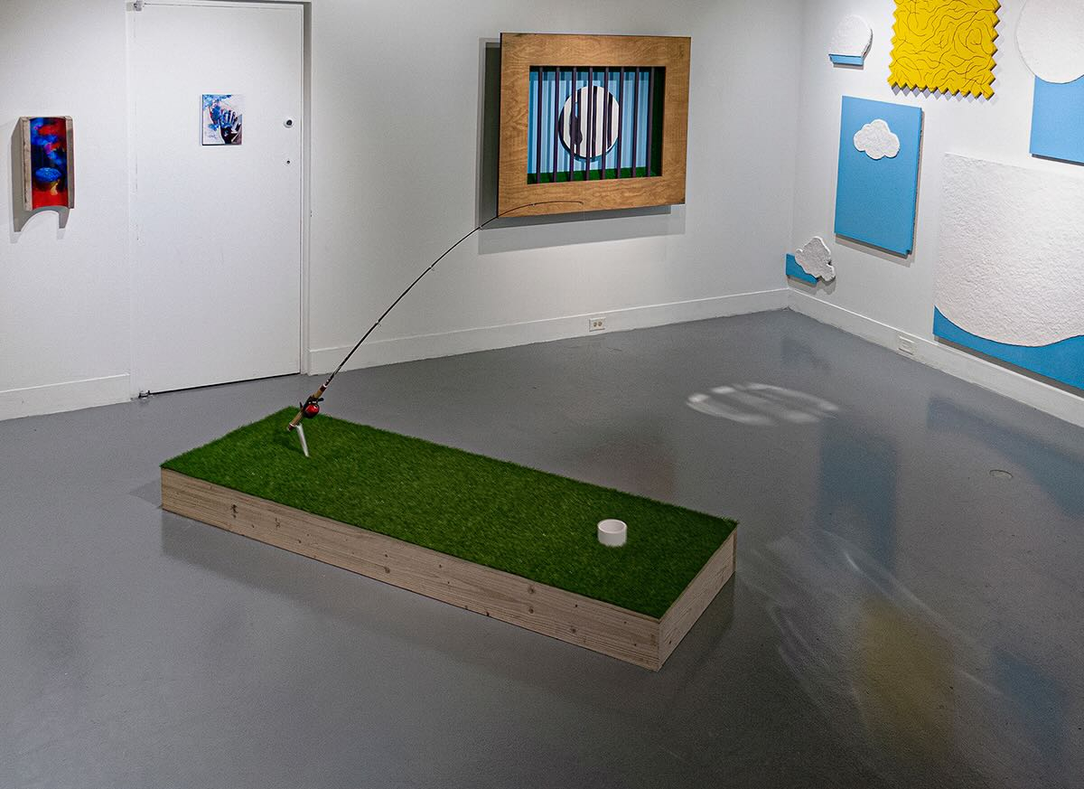 Floor foreground: Quarantine (2021), Fishing pole, PVC pipe, AstroTurf, wood, 60 x 32 x 96 inches; Center back wall: Liberation of the Saint (2021), AstroTurf, paint and mirror on wood 46 x 58 inches