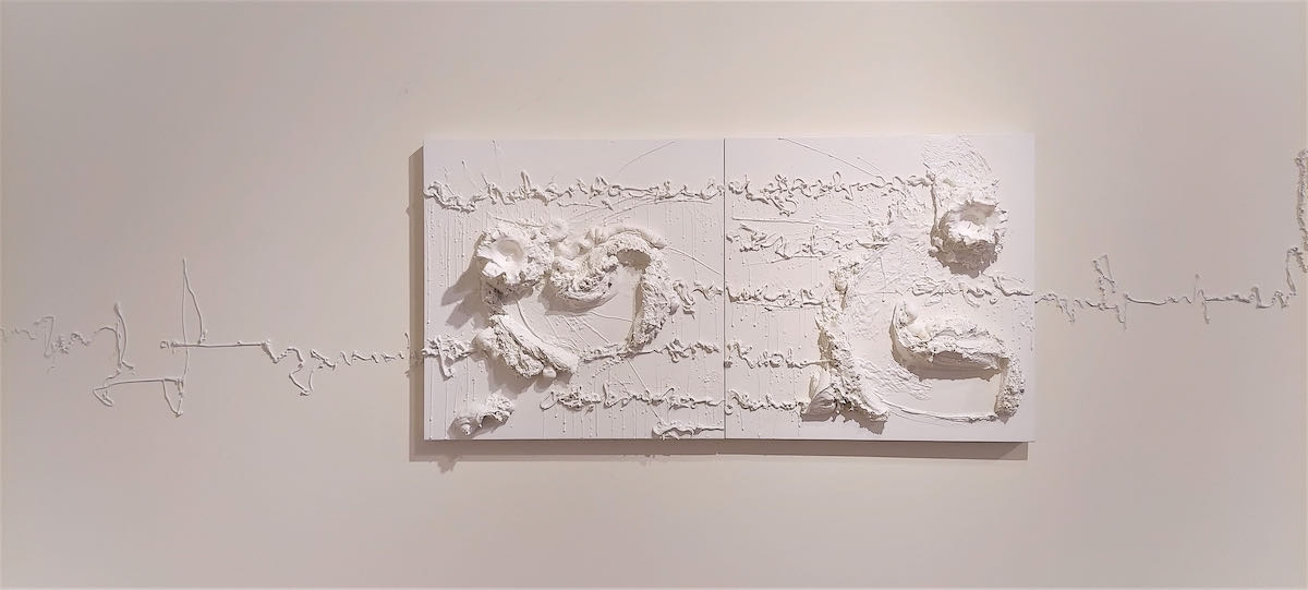 The Humming works are comprised of pure white melting candles and wax representing vigil ceremonies that entreat others to be kind. The skeins of silicone thread connect one piece to the next in peregrinating waves on the gallery's white walls. In her Humming, 2022 (Mixed media on canvas, 50x50cm) she uses horizontal lines to create jagged lines that appear almost like writing. The white textual references against the pure white backdrop surrounded by white frames, appear as if written with clouds or soft cotton. A diptych, one of her all-white Humming, 2022 series paintings comprise two partially melted white candles within a space filled with textual references that continue from the wall onto the painting's surface via wavy lines. The candles are guttered and one could almost hear their desperate sputtering flickers corresponding to the artist’s pleading for peace and civility.