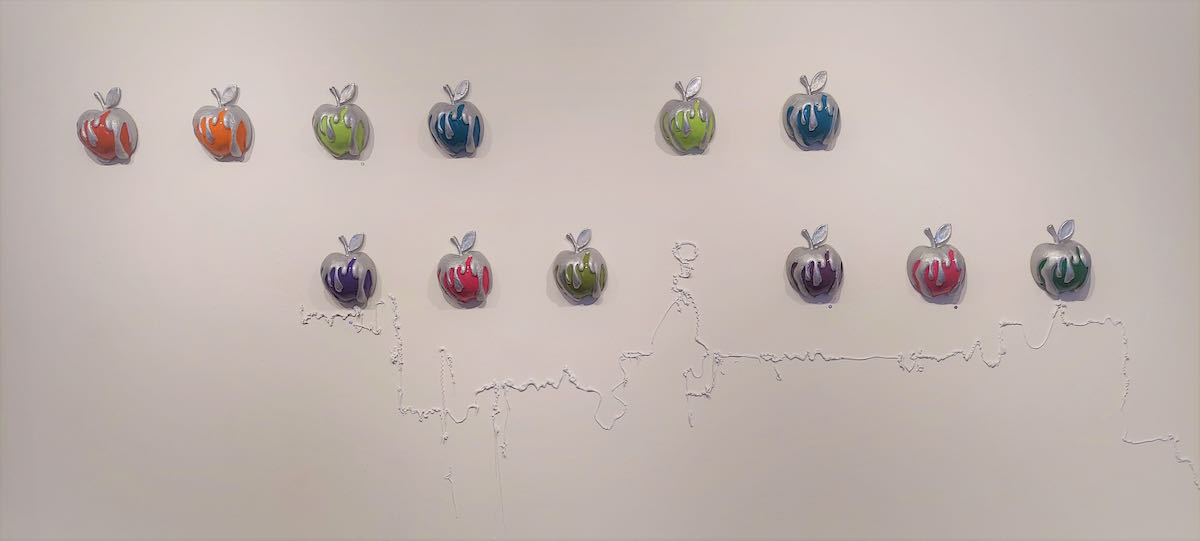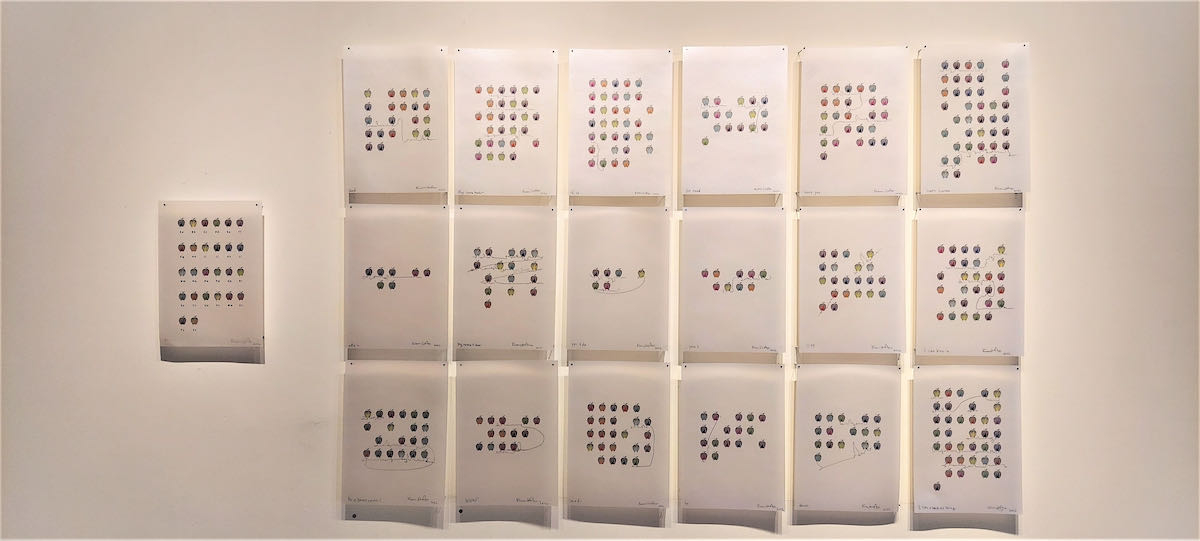 As a response to another cyber comment "do you know how to draw an apple?" Kwon used the apple motif to systematize her own alphabet by assigning meaning to each color corresponding to a music pitch and then using it in messages. The first of these drawings on vellum is the language key that were it followed, would allow the viewer to read her comment. This interactive aspect in the Apple works is also indicative of installation art. She includes Tweets such as the mean one about Obama that states "is there any way we could fly Obama to some Golf course halfway around the world and just leave him there?" to which Obama responded with "I think that's a great idea". As a follow up and in her secret language the artist writes a similar message to Obama's with apples.