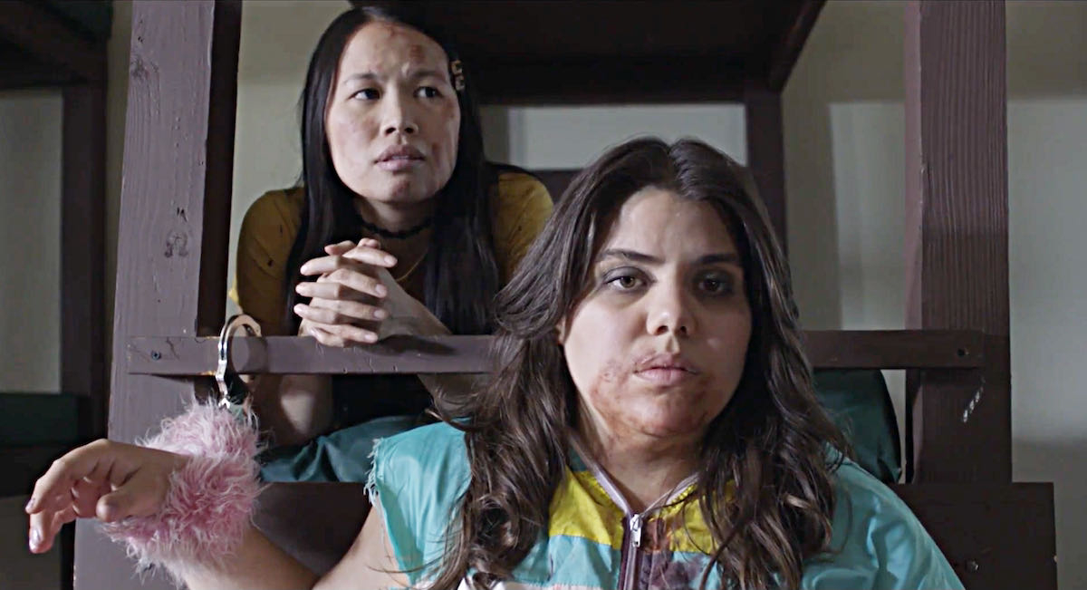 But it all comes down to Lucy (Brooke Markham) and Karen (Vyvy Nguyen), two pals who work at the local Dairy Queen-style Friendly Freeze. They resist the idea that they're losers, staying in their hometown after high school and not fulfilling their potential, from a snarky rival classmate. Their specialty is the Shaky Shivers drink (hence the title). Enter a feral woman in a dirty shift who looks to have tree branches growing out of every orifice. Karen (the accommodating one) seeks to accommodate, while Lucy (the feisty one) gets in the crazy lady’s face, until a hand that has teeth (!) darts out and bites her and sends her into a black void. She comes to at Camp Happy Bear, where she and Karen bonded in childhood, buck naked except for handcuffs, the steering wheel of her car hanging off the other end of them.