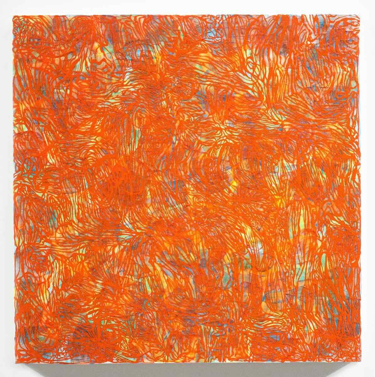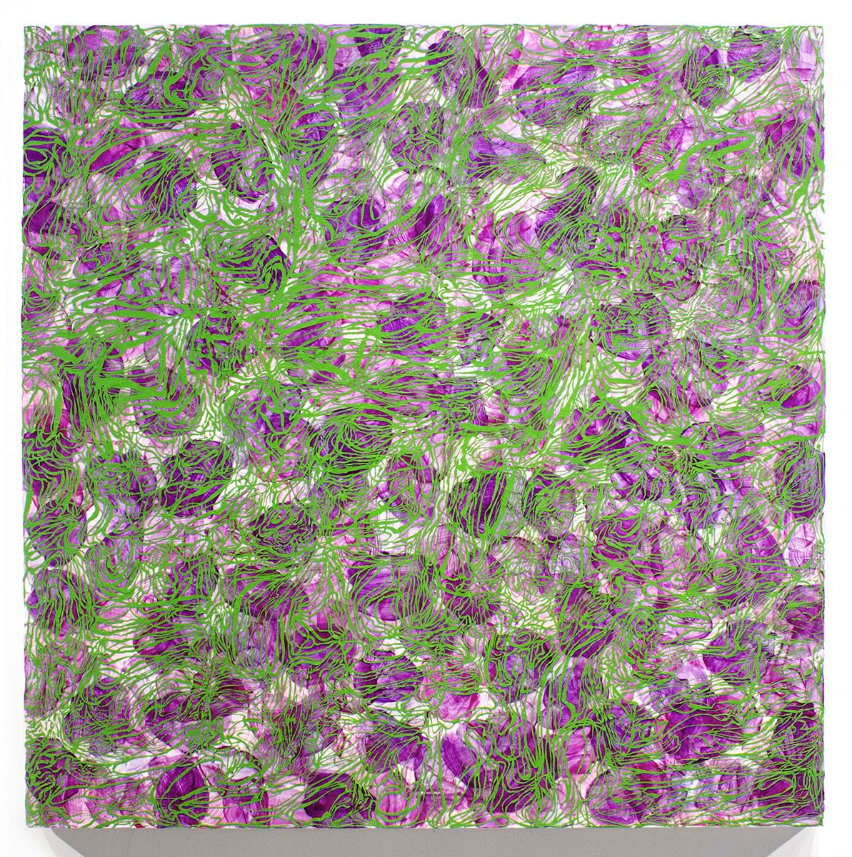 Michael's approach is first to lay down what he refers to as his "deferred" ground of vibrant color. Here, we see leaf-like applications of transferred veneers of dry brush strokes that modulate slightly in intensity and opacity, all looking like flattened fall leaves or flower petals, only much more intense in color. Over this layer of acrylic "skins,' the artist applies the "direct" half of his process: oil paint in a mesmerizing matrix of thin lines in a color complement. This powerful element further triggers the underlying hues, creating a push/pull of optical sensations.