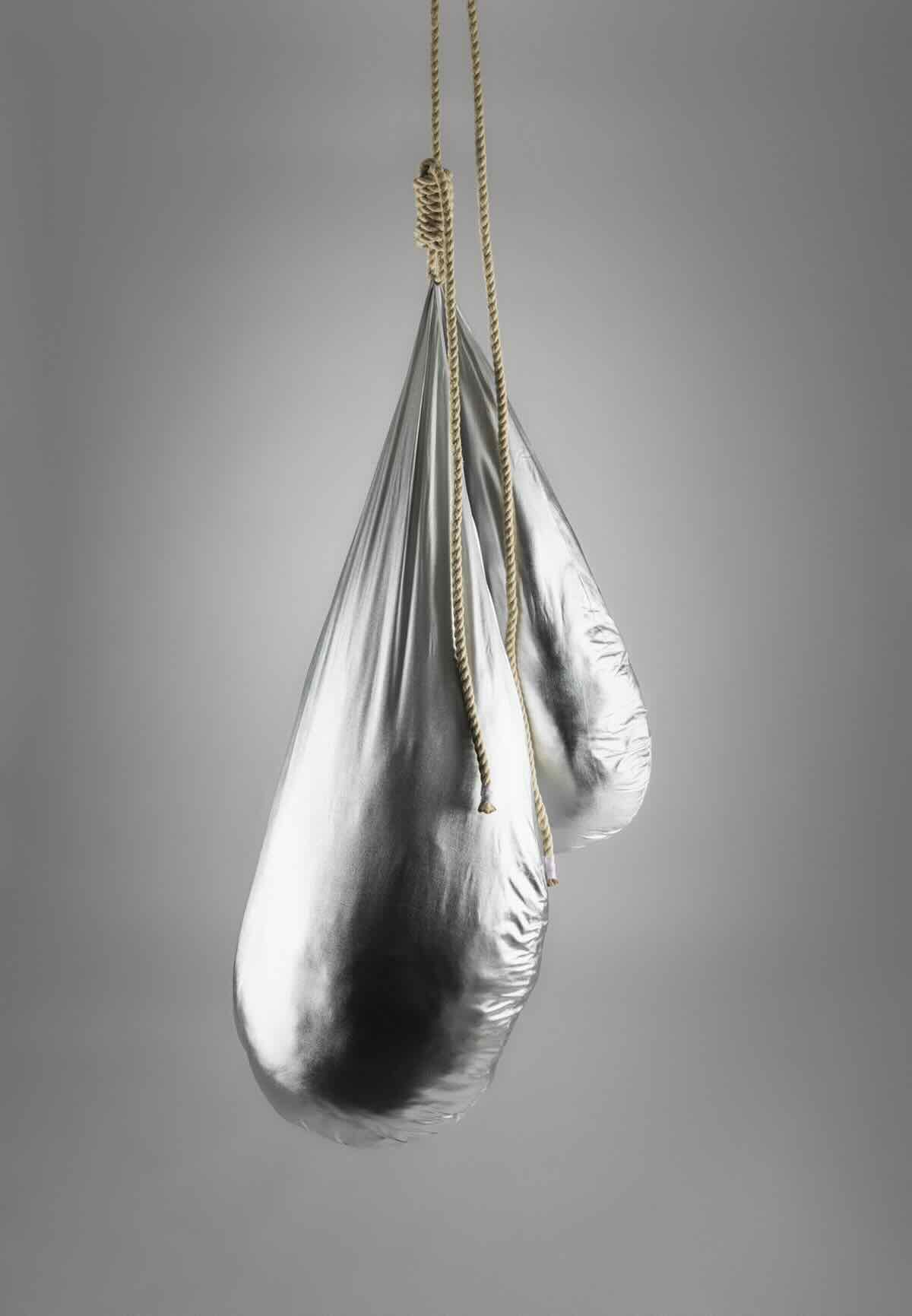 Randi Samsonsen's "Drop Dead, Gorgeous Balls" hanging sculpture combines the seriousness of  the sculptural form and the abstract materials, associations, with the  humorous poetry of the titles of the work.  It's all about the material and the associations, the material evokes in the viewer on the one hand soft dangling sensuous fabric while at the same time they are clearly anchored in a serious and dark tone by noose-tied rope.