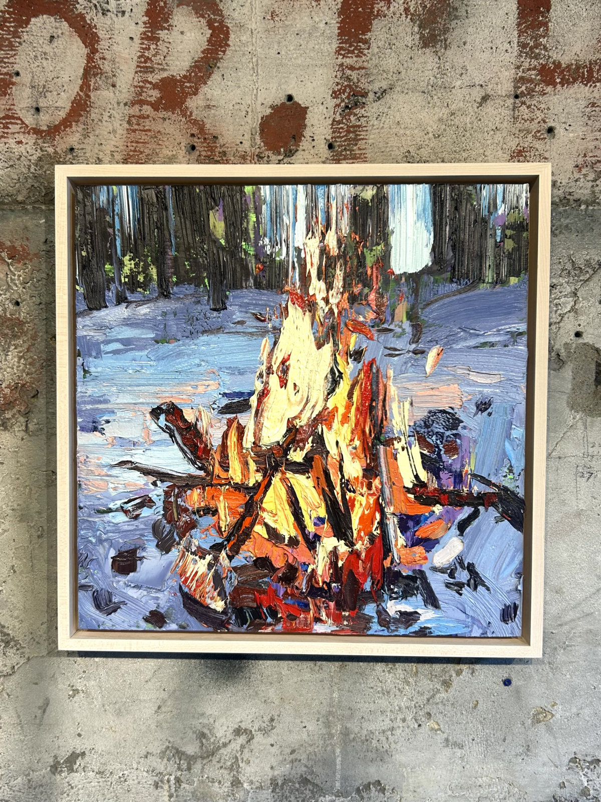 Her "Campfire in Snow I" painting finally fills the space, acting as a mediator between the blue and the orange. You are no longer looking into a clearing but are focused on an object and an activity. The flame crackles in swathes of hot colour, melting the blue. The broken branches take on a broken figure appearance, like an abstracted body.