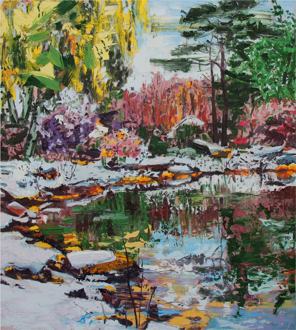 "Pond with Early Snow III" increases the chromatic value of different parts to distract your attention from the whole. The snow obscures areas of the scene. The water, the land, and the sky share colours. Everything teeters on the edge. It's all part of dematerializing the subject.