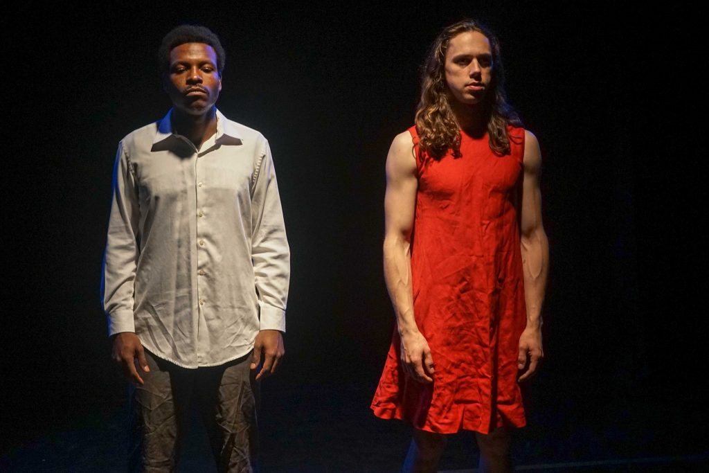 {Flying} Dutchman unfolds at and around a single table with a chair and a tabletop microphone at either end, lending to the proceedings the incongruous air of a hearing or deposition. The set-up is simple, though what arises from it is anything but: a white woman, Lula (Jonathan Schenk), strikes up a conversation with Clay (Malcolm B. Hines), a black man, whom Lula asserts has been staring at her through a window. She interrupts Clay in the midst of a sort of poetic monologue, a situation that is repeated in inverted form later in the play. Prone to unpredictable outbursts, Lula openly identifies herself as a liar, and some of both the tension and the comedy in the first half of the production come from the juxtaposition of this erratic, barefoot woman's proddings and pronouncements with the calm, suit-wearing Clay's even-keeled reactions. The aggressor in these interactions, she impels Clay to invite her to the party that he is headed to and describes the trajectory that their evening will take in increasingly heated terms. An Eve-figure in a red dress, she offers him an apple, which he accepts (he refuses, for what it is worth, another). Eventually, Lula pushes Clay far enough that it completely upends the dynamic to that point. There is a heavy strain of self-as-performance in this play, and both characters ultimately abandon that public-facing performativity (perhaps ironically making them more alike). One of the producers of Dutchman's initial run was Edward Albee, and there is something of Jerry and Peter's encounter in The Zoo Story in {Flying} Dutchman, their stripping away of the veneer habitually presented to society. What Lula and Clay uncover is deep-seated rage and the constant immanence of betrayal.