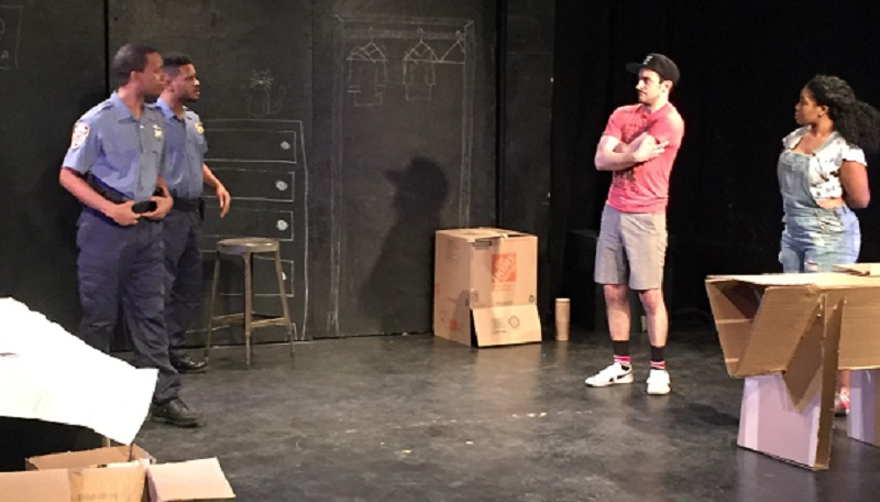 Daniel and Tina are both nuanced characters, both flawed: she acts questionably when she fears that the justice system will ruin the rest of her life; he expresses resentment at, as he frames it, living in an unending race and gender studies class. The play actually felt longer than its run-time, which is a compliment: it packs a lot of emotional journey into its 60 minutes, facilitated by the superb performances of Henry and Ruffin. Gerrard James and Donnell E. Smith as, respectively, the overzealous Officer McRoy and the more level Officer Davis -- who is himself in a relationship with a Jewish woman and who talks about how the landlords who gentrify buildings don't follow building codes and laws -- are similarly impressive, and funny, in the relatively short time that they appear. Complementing the symbolism of the accident is the way that the neighborhood itself, aside from the police, remains outside, offstage, although some of its voices penetrate the couple's apartment at the beginning and end of the play. The ambiguous ending does not pretend to resolve the issues that the play raises, and the question of whether and how they can forgive themselves takes on multiple dimensions. By turns funny, biting, and affecting, Mad Cool gets a recommendation as high as a precarious window unit.