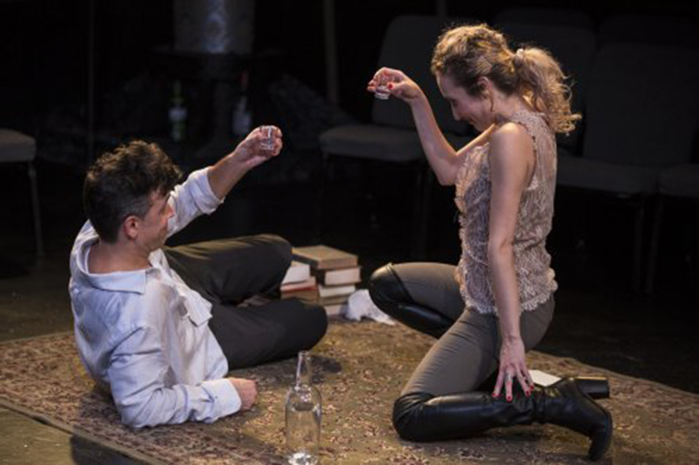 Many of the characters' interactions are also suffused with vodka, and vodka bottles appear everywhere around the intimate performance space. Platonov is staged in the round, with the central performance area often defined by little more than a rug, and the performers use the entirety of the theater, including areas behind the audience, and rarely exiting, even for costume changes. The occasional crescendos built into the sound design, the striking physicality of much of the acting, and the overlapping and interruptions in the delivery of the dialogue all work with the space itself to create a captivating immediacy. This crisply directed production tosses the audience in in medias res and sweeps it along, the overlapping dialogue reflecting the web of the characters' entanglements, and the continuous action is itself Shakespearean in its unbroken flow across a bare stage. It is more than possible that one could map parallels and oppositions onto the symmetrically gender-blind doubling of all of the roles except Anna and Platonov, but we will limit ourselves here to saying that the entire cast does magnificent work. Valentine lends a melancholy undertone to his charmingly funny Nikolai. Stokes makes it easy to see why Platonov is the object of nearly everyone's desire and everyone's interest; he functions as one of the play's magnetic poles, and Abraham's Anna operates as the other. It is not entirely surprising when Anna makes an appearance as essentially a dominatrix; she is confident, does not suffer fools, and knows what she wants. Whether she can get it is another question entirely.